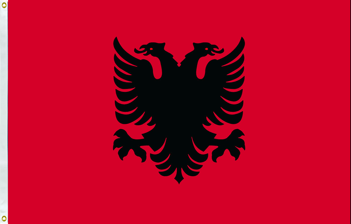 Albania – The most popular standard 3×5 foot Flag is lightweight Knitted Polyester that makes the flag flying high to its attractive appearance. Four-color sharp and vivid process printing is done on one side and it bleeds through to the other side as well. All flags have 2 brass rings grommets located on 1 side – Top & Bottom toward corners. Grommets are standard-size flags used for easy attachment to a flag pole kit. This flag is made in China. (pole not included).