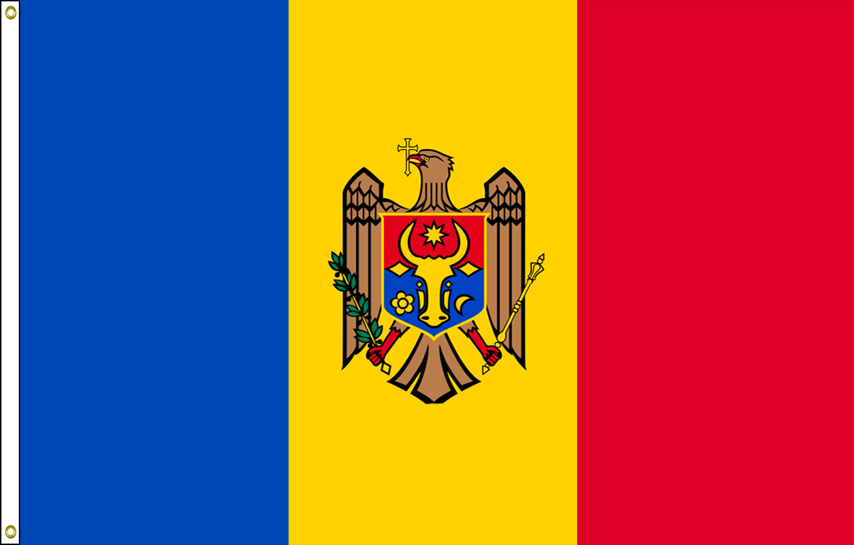 Moldova – The most popular standard 3×5 foot Flag is lightweight Knitted Polyester that makes the flag flying high to its attractive appearance. Four-color sharp and vivid process printing is done on one side and it bleeds through to the other side as well. All flags have 2 brass rings grommets located on 1 side – Top & Bottom toward corners. Grommets are standard-size flags used for easy attachment to a flag pole kit. This flag is made in China. (pole not included).